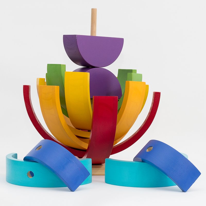 Su madera, imperfecta y natural, les da información sensorial muy valiosa. Sus piezas les ayudan a diferenciar formas y colores. Manipulándolo ganan destreza y coordinación. A través de él van comprendiendo conceptos complejos como el equilibrio, la simetría y la resistencia. Les abre la puerta de par en par al juego simbólico, a construir escenarios e imitar situaciones de la vida real.